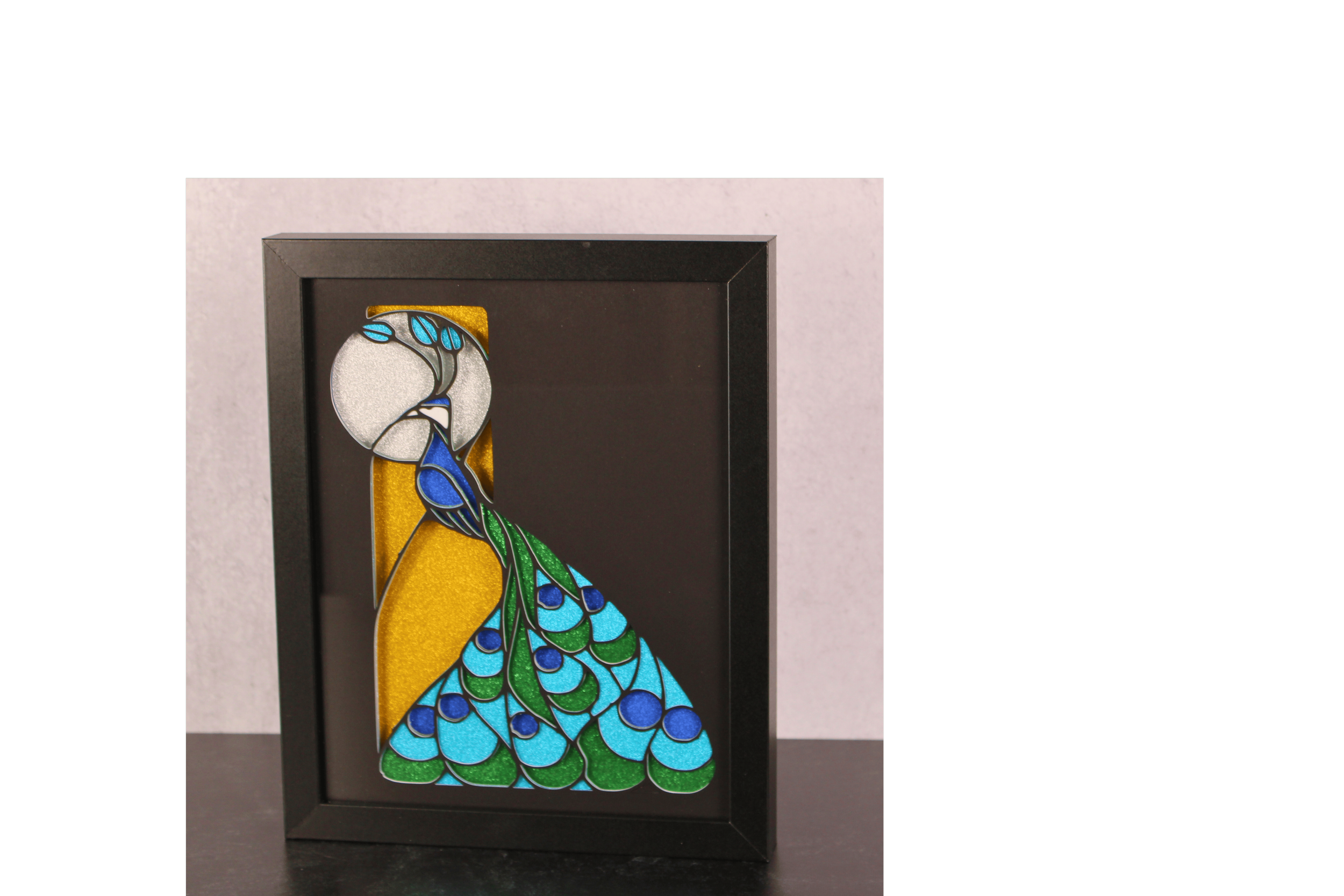 Offered in an 8” x 8” frame with a glass front. Hanging hardware is already on the back & the piece is wide enough to sit securely on a shelf.