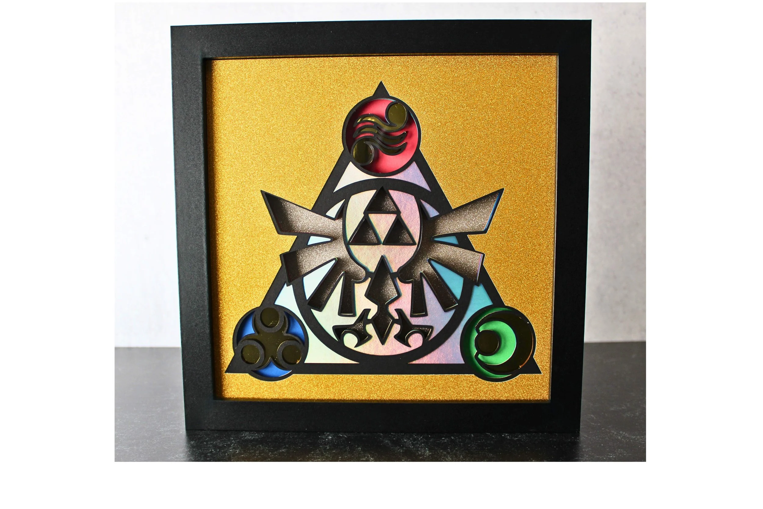 Offered in an 8” x 10” frame with a glass front. Hanging hardware is already on the back & the piece is wide enough to sit securely on a shelf.